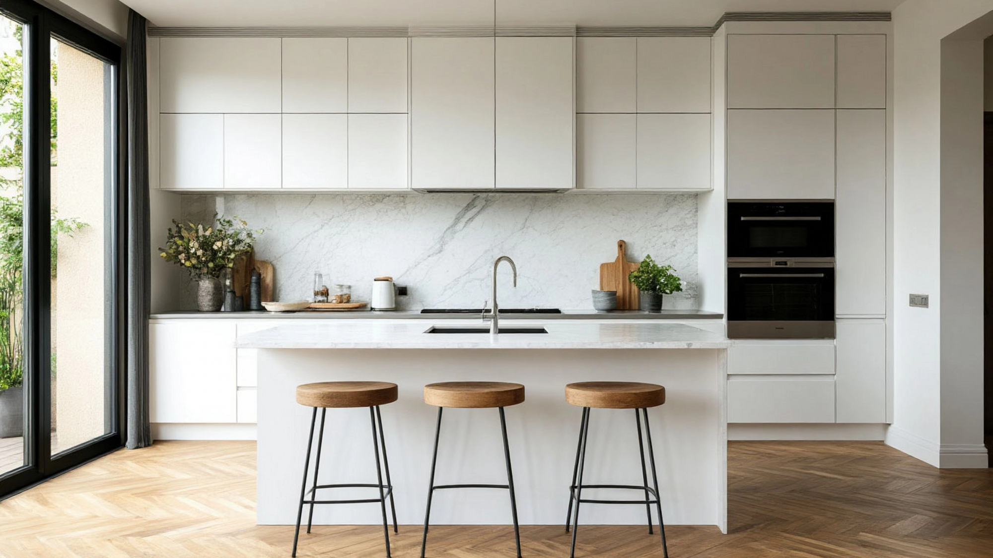 Эта кухня идеально подходит для современных домов и квартир. Белый цвет фасадов делает пространство светлым и визуально просторным, а современный стиль позволяет легко интегрировать кухню в любой интерьер. Просторные шкафы, выдвижные ящики, встроенная техника и продуманная планировка создают комфорт и удобство на каждом шагу.