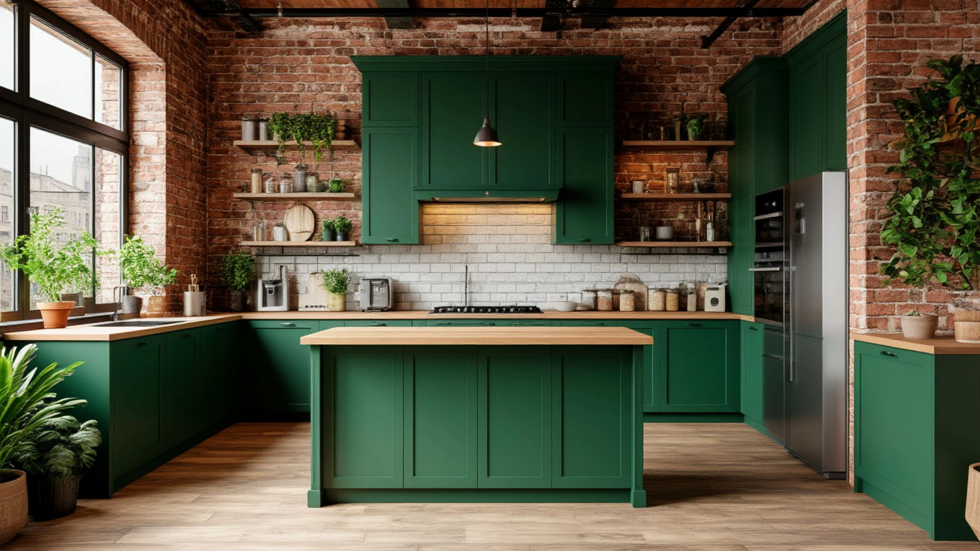 Неотъемлемой частью кухни "Камден" является её способность интегрироваться в различные интерьерные концепции. В квартире-студии лофт часто предполагает открытые планировки, где кухня плавно переходит в зону гостиной или столовой. Зеленый цвет становится связующим элементом между различными зонами, обеспечивая целостность и гармонию. Контрастные элементы, такие как черные металлические каркасы или кирпичная стена, подчеркивают индустриальный характер интерьера, а натуральные деревянные поверхности создают уют и тепло.