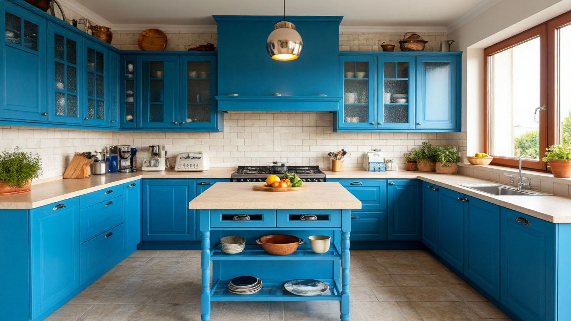 Декор кухни "Морелла" подчеркнуто лаконичен. Здесь нет ничего лишнего — только чистые линии и гармония цвета. Холодный блеск металла перекликается с гладкостью фасадов, а нейтральные оттенки столешницы и стен создают идеальный фон для яркого синего. Всё вместе создаёт чувство равновесия и свежести.
